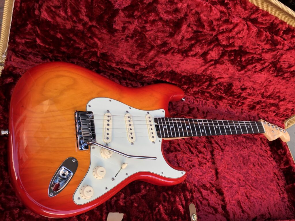 Fender American Elite Stratocaster 2019 üretimi. 9.5″ ten 14″ e compound radius abanoz klavye. Ash gövde. Aged Cherry Burst renkte. 4th Generation Noiseless manyetikler.