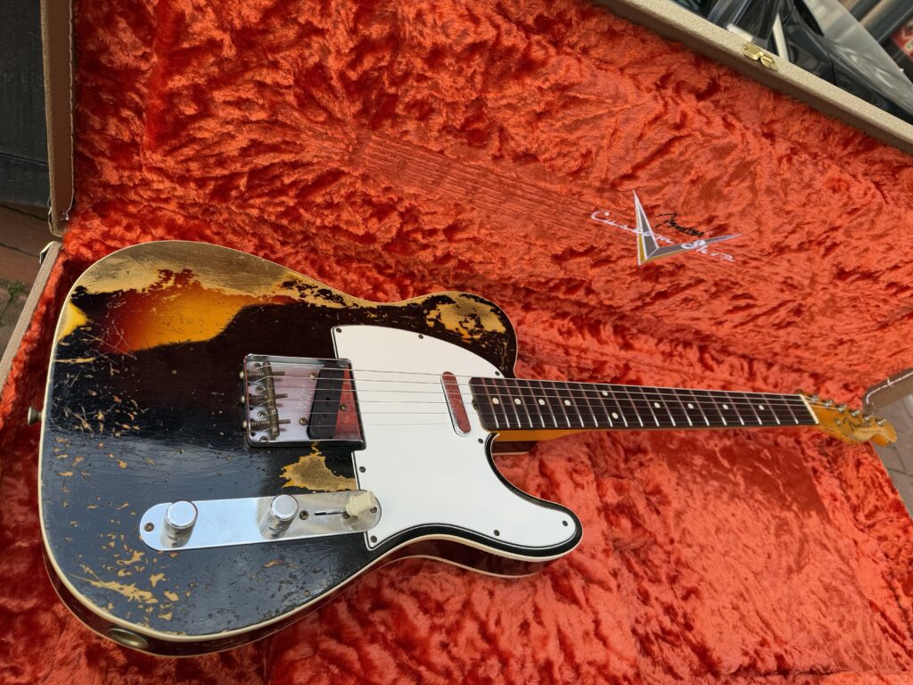 Fender Custom Shop Limited Edition 1959 Telecaster Custom Super Heavy Relic Fotoğraflardaki gibidir. 3 color sunburst üzeri siyah boyalı. Handwound Twisted Tele Sap manyetiği. Broadcaster köprü manyetik. Üst düzey bir gitar. Tüm parçaları orijinal. Orijinal Hardcase.